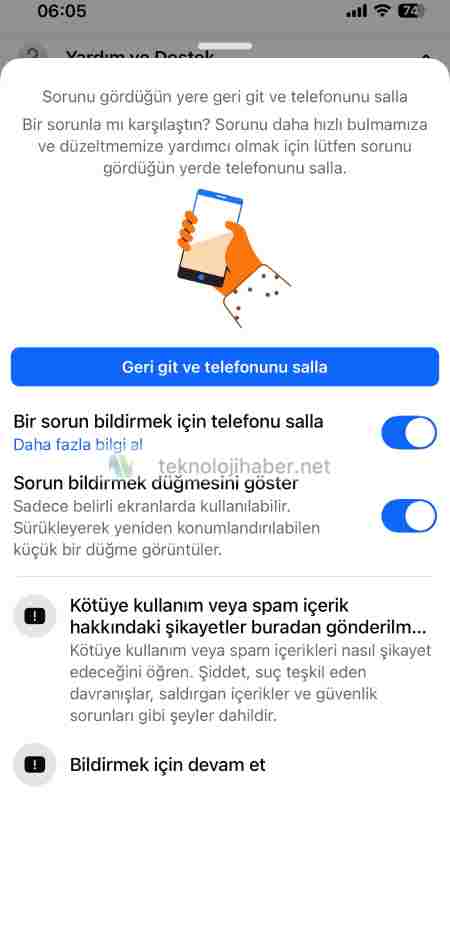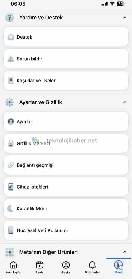 Facebook hesabınıza erişiminiz hala varsa, uygulamadan “Menü” yazılı profil simgenize dokunun. “Yardım ve Destek” başlığı altında “Sorun bildir” ile devam edin.