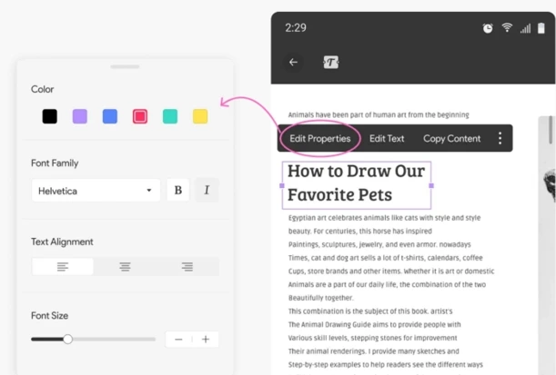 Çoğu PDF uygulaması nadiren Android için düzenleme özelliğine sahip olsa da, PDF bu konuda öne çıkar ve akıllı bir PDF düzenleyici olarak dikkat çeker. Daha önce eklenen metni düzenlemeyi veya yeni metin eklemeyi mümkün kılar. Aynı durum resimler için de geçerlidir.